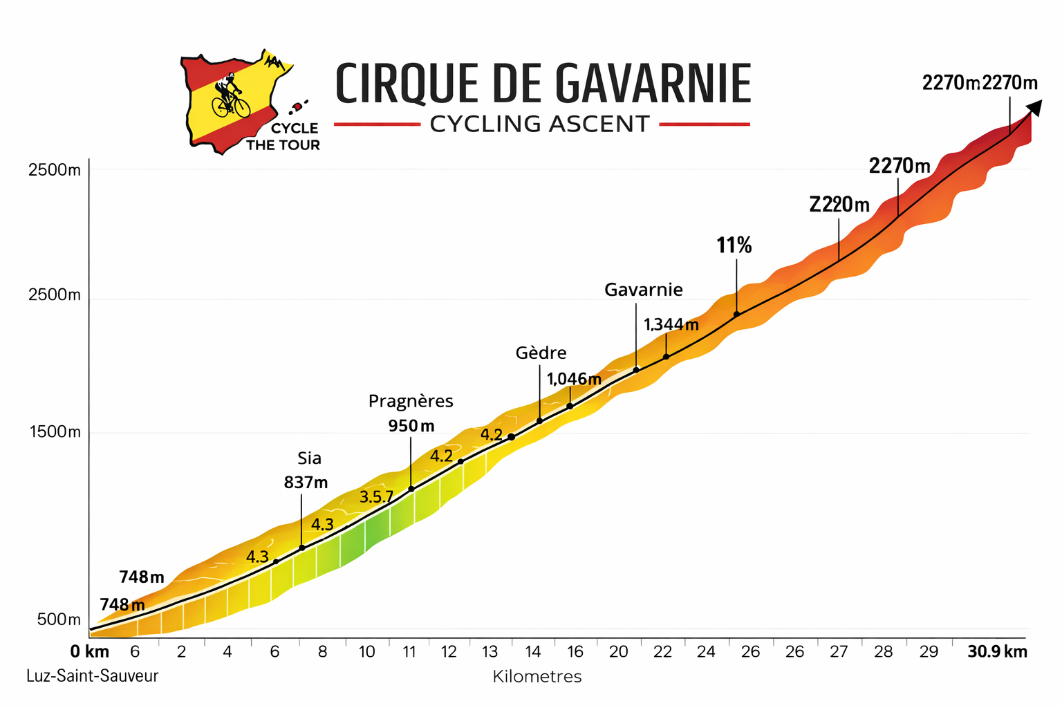 Starting from Luz-Saint-Sauveur, you’ll wind your way up 16 kilometers, gaining 1,500 meters in elevation with an average gradient of 7.4%, reaching the summit at 2,116 meters above sea level. The ride is nothing short of exhilarating, with breathtaking views and a sense of achievement that only the Tour de France’s most iconic climb can offer.